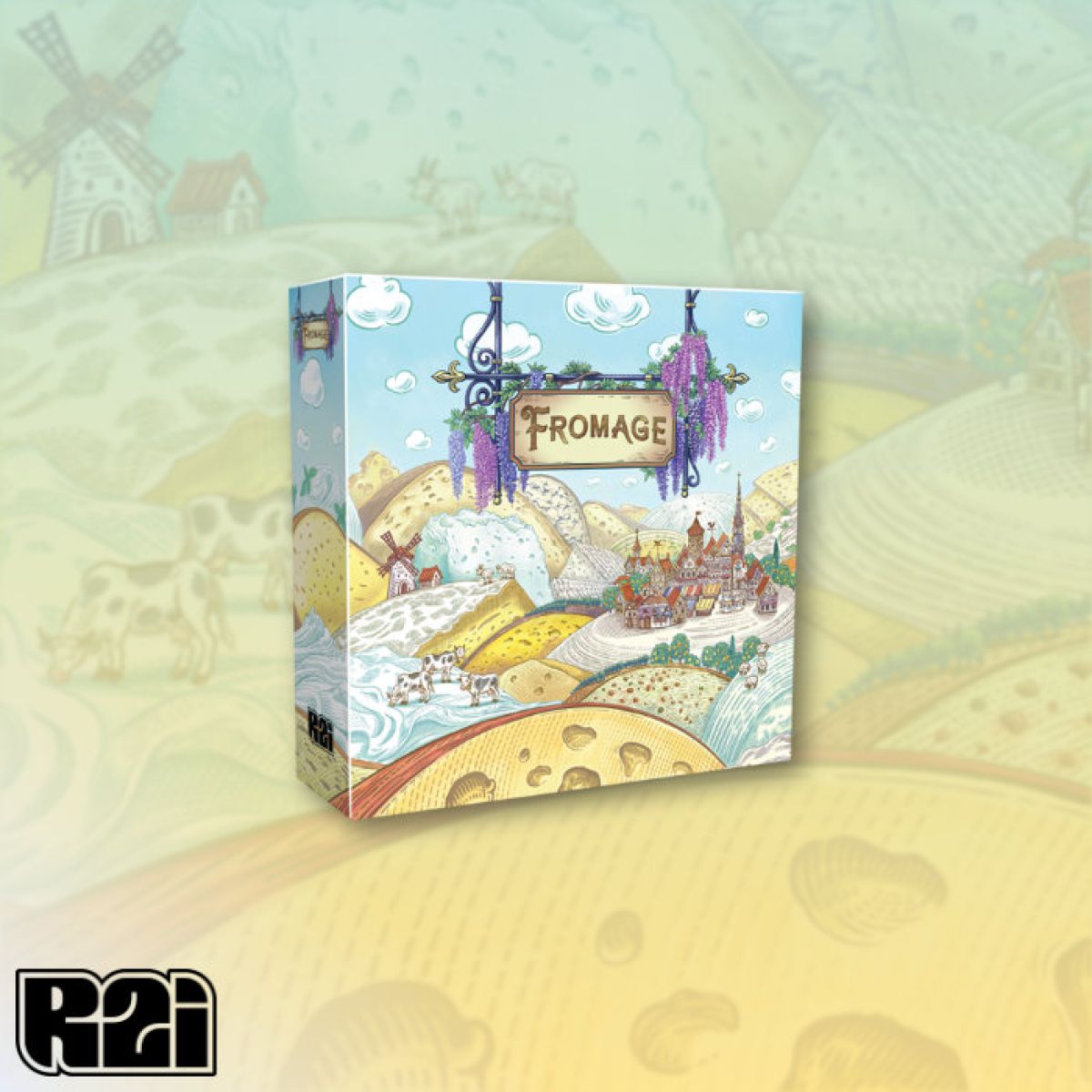 Fromage is a simultaneous worker-placement game where players place Workers to make cheese and gather resources from the quadrant of the board facing them. Once all players have placed their Workers, the board rotates, aging any cheese that was made, and presenting each player with a new quadrant to place Workers into. Score Prestige Points by selling cheese to the four locations, and by efficiently managing and upgrading your creamery.