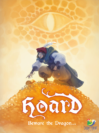 Hoard is a dynamic game of hand management, set collection, and press-your-luck. Each turn players take one of four possible actions: 1) roll a custom die and move to take a new card, 2) secure a set of treasures or add to an existing set to score points, 3) affect the dragon, who wakes in stages from his tail to his head, by playing cards that soothe or rouse him, or 4) use a sword on an opponent or capture a used sword with a shield. The board is composed of 12 facedown cards surrounding the dragon. It changes as players remove and replace the cards. Dice rolls between 1-5 enable clockwise or counterclockwise movement and the special symbol allows access to all but one of the cards, so it is a game that rewards memory.