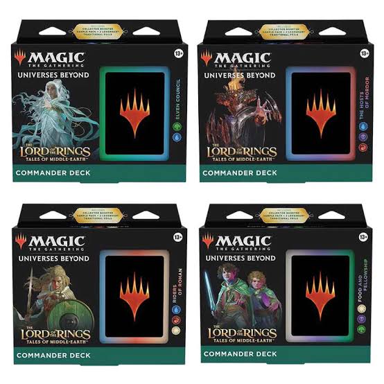 - Contents—1 ready-to-play The Lord of the Rings: Tales of Middle-earth Commander Deck (includes 2 Foil Legendary cards), a 2-card Collector Booster Sample Pack, 1 Foil-Etched Display Commander, 10 double-sided tokens, 1 Helper card, 1 life tracker, and 1 deck box